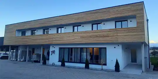 So sieht die Außenansicht von den neu geschaffenen Fremdenzimmer beim Reiterhof in Dietach aus. So modern und schön die Außenansicht mit der
