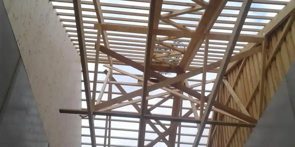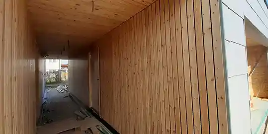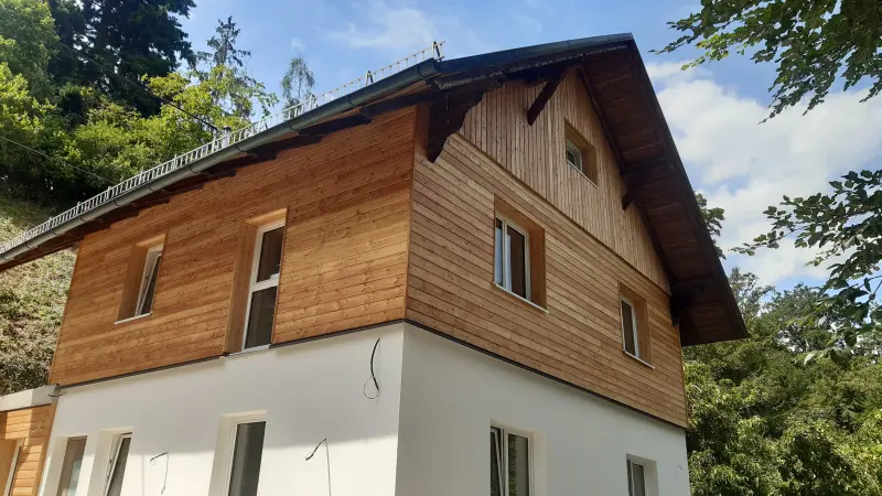 3D- Lärchenfassade, sowie Holzweichfaser- Putzträgerplatten