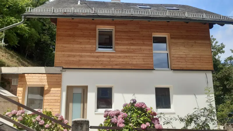 Das Haus aus den 70ern wurde nun auf 2 Seiten mit einer Wärmedämmung und einer schmucken Lärchenverschalung versehen. Aufbau wie folgt: 12cm Aufdoppelung mit Zellulose gedämmt, DWD- Platten, Hinterlüftung und dann die Lärchen Nut und Federschalung. Die junge Familie wird schon jetzt im Sommer von der Wärmedämmung (Sommerhitze bleibt draußen) profitieren, und auch im Winter es sehr wohlig warm haben. Eine gelungene sinnvolle Investition in die eigenen 4 Wände, von der man lange etwas hat und optisch dem Haus ein ganz neues schönes Gesicht gibt.