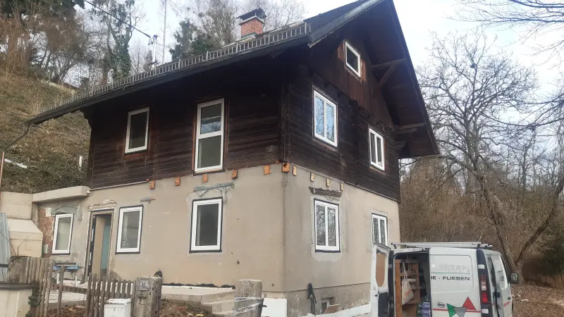 Bei einem bestehenden Haus in Steyr- Land brachten wir vor Kurzem die Fassade auf Vordermann. Es wurde mit einer Holzkonstruktion aufgedoppelt, mit Zellulose gedämmt, und schließlich eine schöne waagrechte Lärchen- N+F- Schalung montiert. Die sehr enge Zufahrt und der kleine Arbeitsbereich waren eine Herausforderung, aber wir schafften das Ganze zur vollsten Zufriedenheit der sympathischen Bauleute.