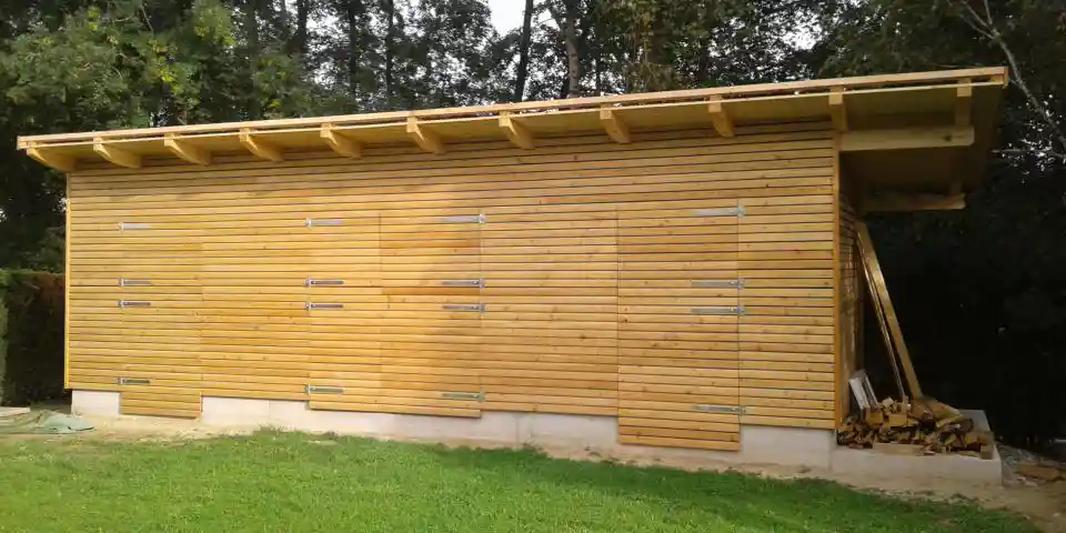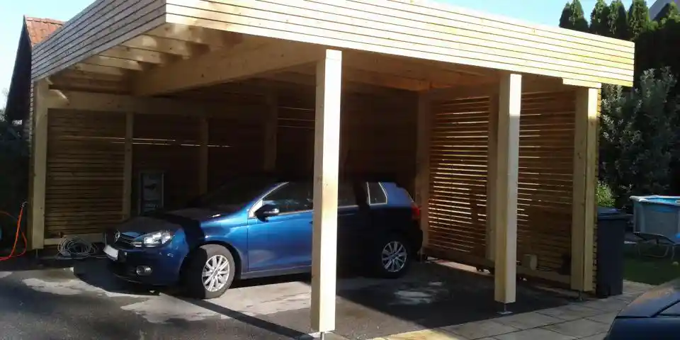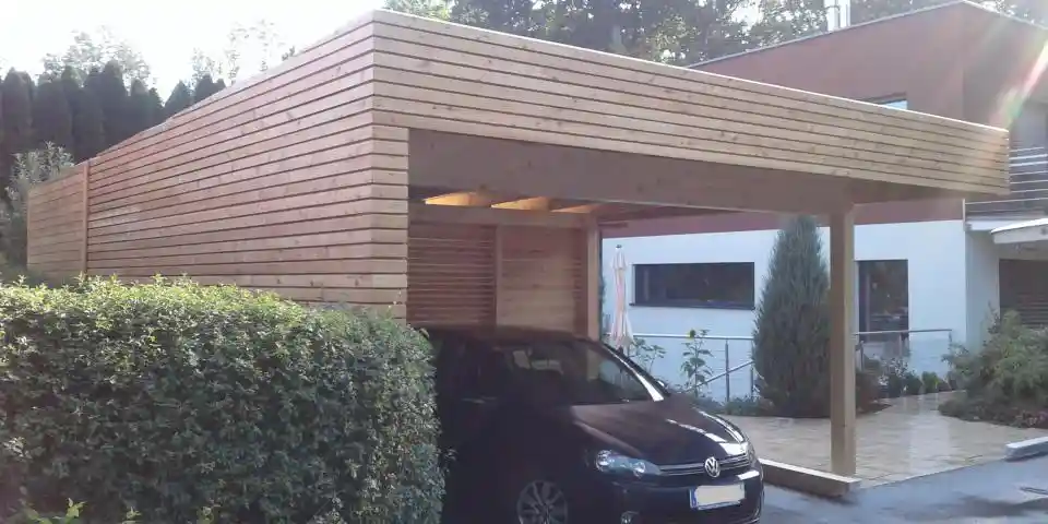 Der moderne Carport beinhaltet zusätzlich im hinteren Bereich einen Abstellraum. Das schnittige Aussehen verdankt die Holzriegelkonstruktion der schönen waagrechten Lärchen- Rhombus- Schalung. Teilweise mit Luft und beim Abstellraum geschlossen, mit N-F- Ausführung. Die Hitze des Sommers und im Winter lästiges Eiskratzen ist nun für die Fahrzeuge und Bauherren tabu...
