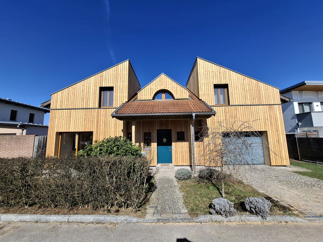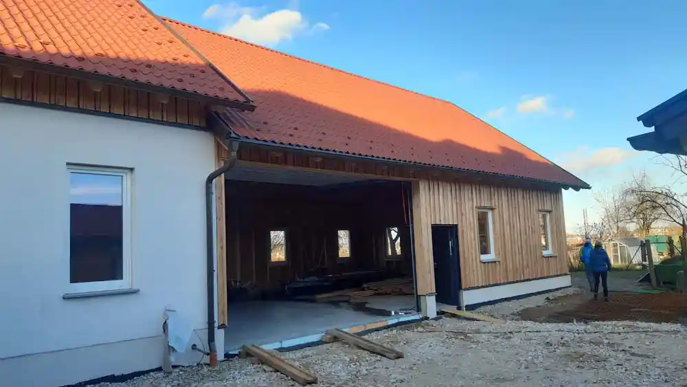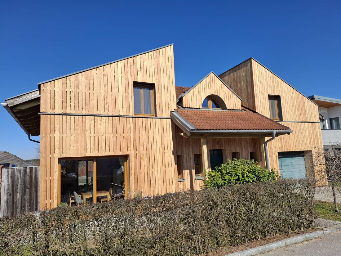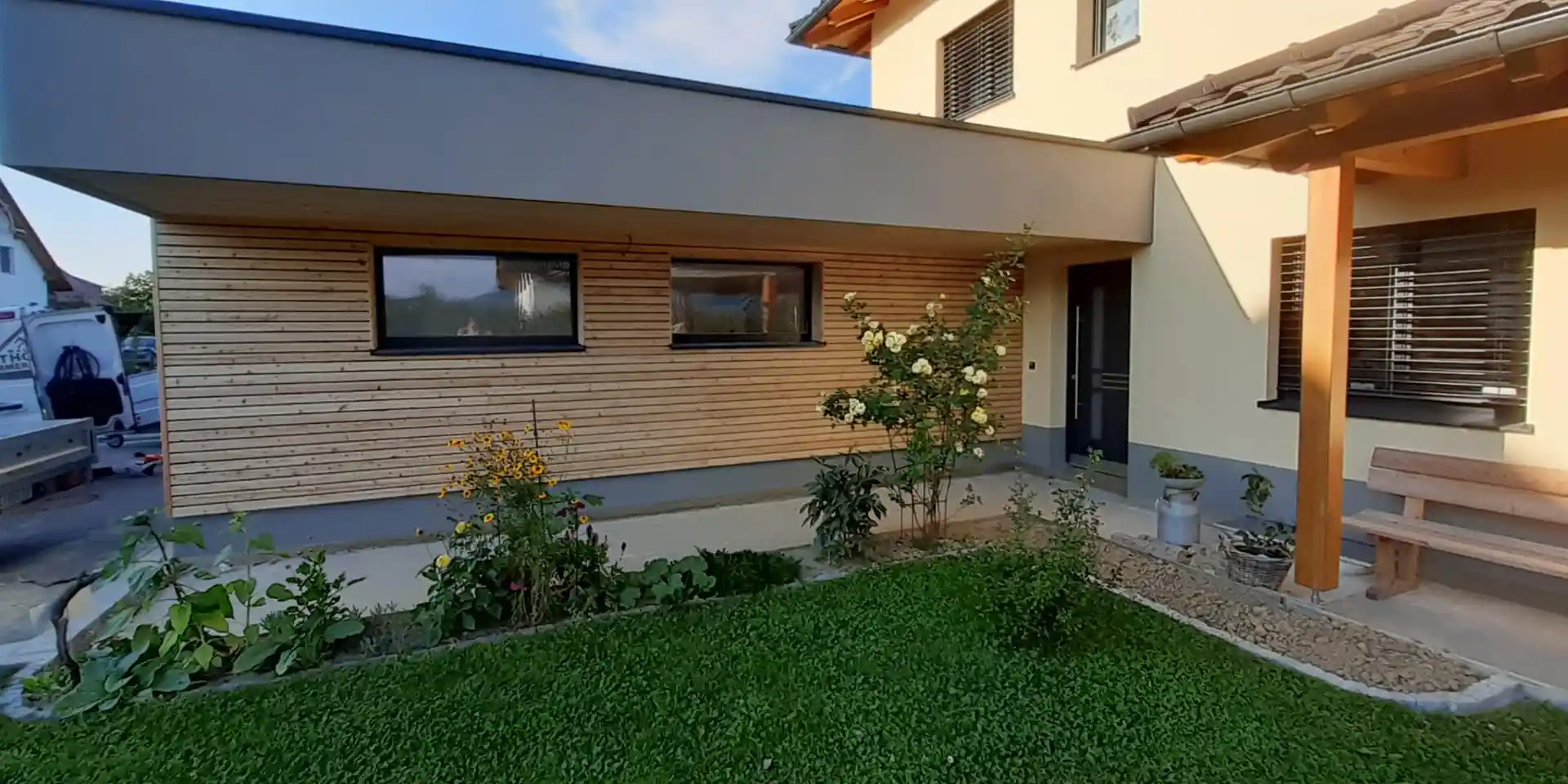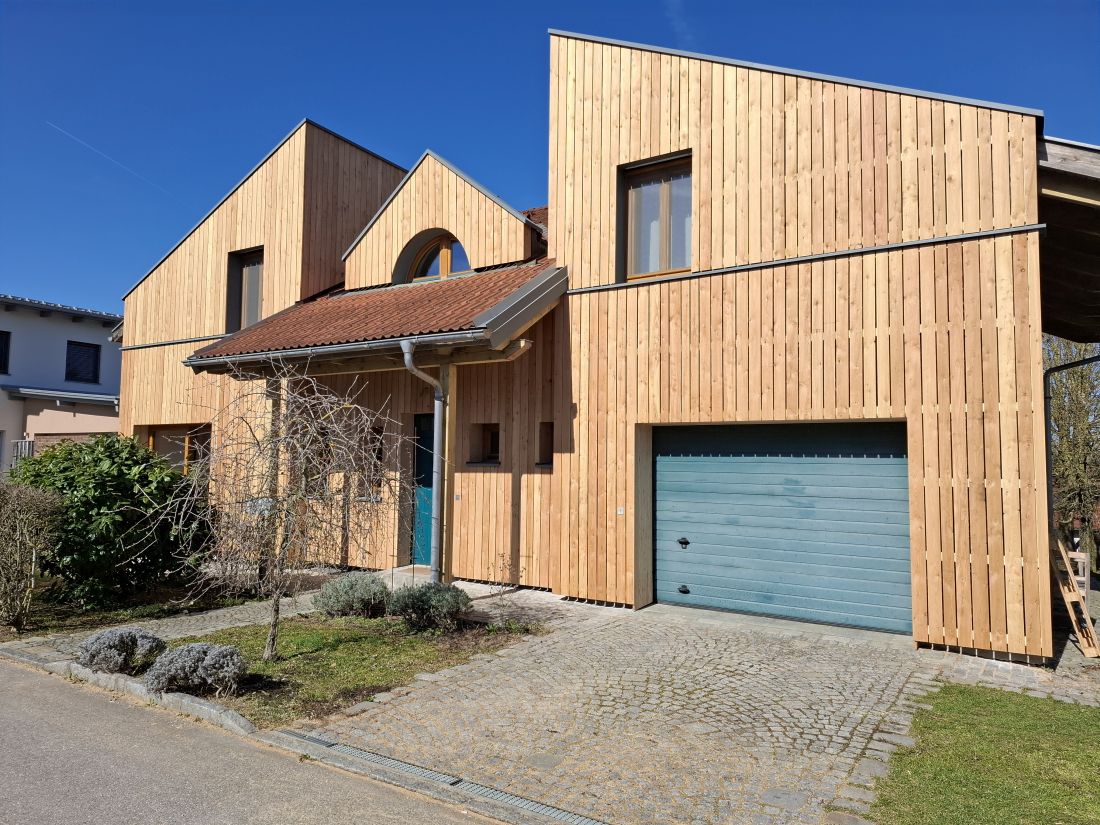 Da die Doppelhaushälfte für eine 4-köpfige Familie zu klein wurde, errichteten wir passend zum Bestand einen modernen Riegelzubau. Dieser beinhaltet im EG ein Büro sowie einen Geräte- und Wirtschaftsraum, im OG ist es ein großes Fitness- und Spielzimmer. Sowohl die Tramdecke als auch die Riegelwände sind mit Zellulose gedämmt. Der von Innen sichtbare, gehobelte Pultdachstuhl ist nach oben mit eine Aufsparrendämmung gegen Hitze und Kälte perfekt geschützt. Die Außenfassade wurde mit einer schnittigen hinterlüfteten Lärchen- N+F- Schalung versehen. Mit dem Carport vorne ist es eine absolut gelungene Erweiterung des bestehenden Hauses.