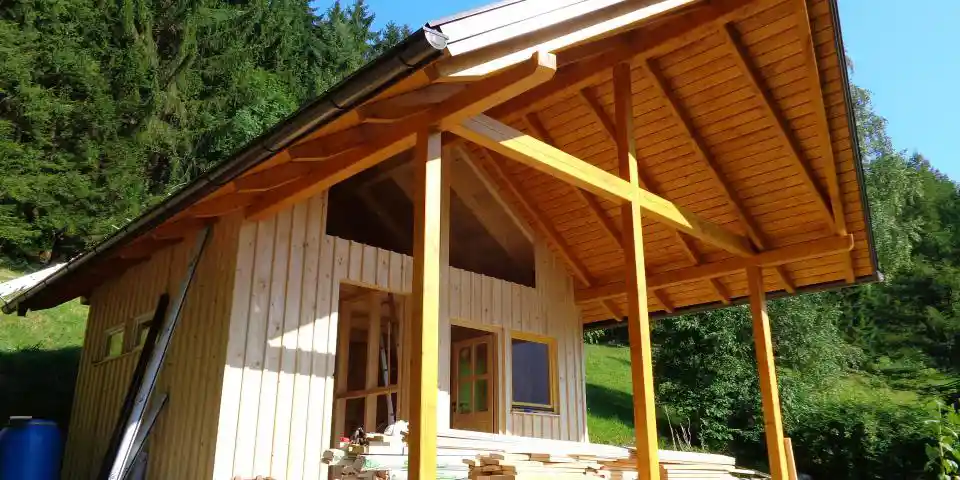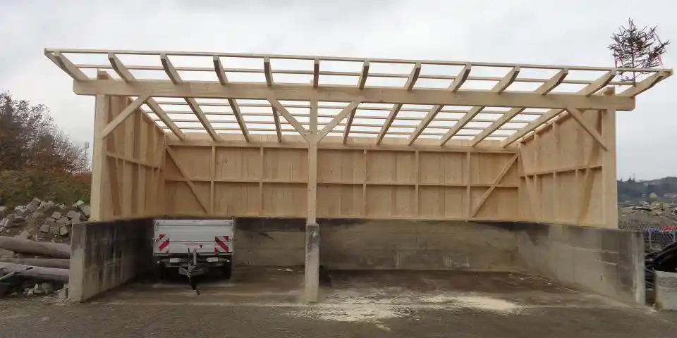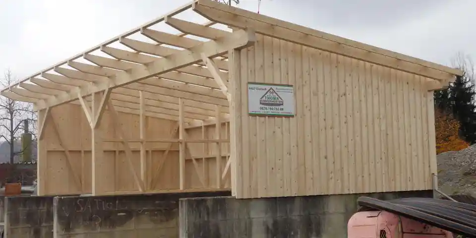 Ein bestehender Lagerplatz wurde mit einer Holziegelkonstruktion, und in weiterer Folge mit einem Pultdachstuhl versehen. Die 3 Außenwände bekamen eine gehobelte Sturzschalung an einer Seite, und das Dach wird mit einem Profil- Blechdach eingedeckt. Somit ist vor dem ersten Schnee ein wichtiger zusätzlicher überdachter Lagerplatz entstanden.