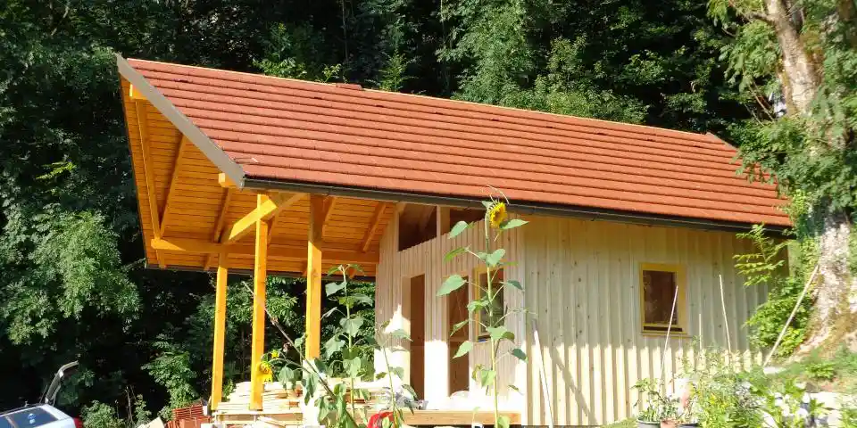 Das im Ennstal errichtete Gartenhaus wird sowohl als gemütlicher Aufenthaltsraum als auch als Sauna mit Dusche genützt werden. Den speziellen Reiz dieses Gebäudes macht sicherlich der nach vorne verlängerte First aus, der die Ansicht spektakulär macht. Nachdem die Lä.- Holztramdecke verlegt war, errichteten wir die Riegelwände und darauf Innen eine Zangendecke, sowie den Satteldachstuhl. Die Verschalung wurde gleich im Anschluss mit der tatkräftigen Unterstützung der geschickten Helfer in Rekordzeit montiert. Nachdem auch die Fenster eingebaut und die Aussparrungen für die Fixverglasung ausgearbeitet waren, wurde der Lärchen- Bohlenbelag verlegt... und das nächste schöne Projekt war abgeschlossen.