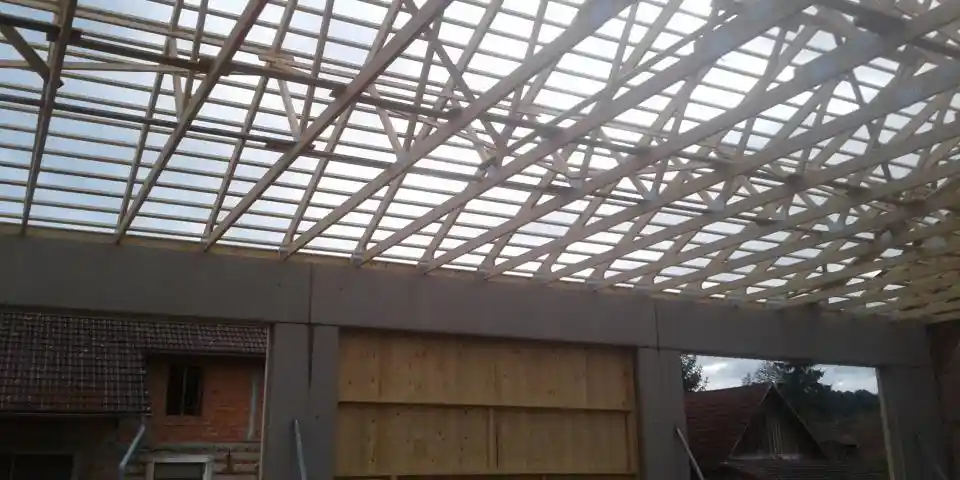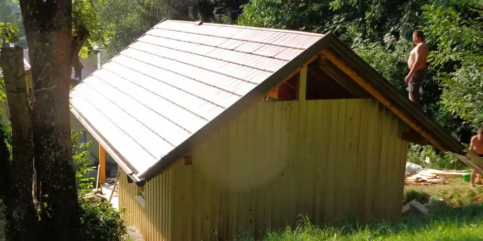 Garage, Werkstatt, Lager und im Nebengebäude noch ein paar extra Räume, inkl. Ziegenstall. All diese beinhaltet unser wohl größtes Bauvorhaben in diesem Jahr. Der 16er Riegel, sowie die 24er Tramdecke wurde mit Zellulose gedämmt, und der Satteldachstuhl mit einem Pfannenblechdach versehen. Samt sensationeller Lä.- 3D- Fassade!