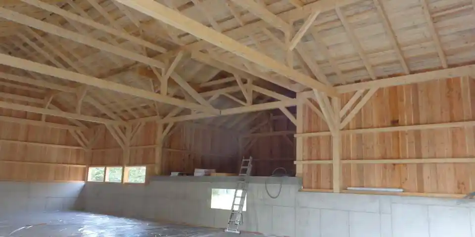 Anstelle der zu kleinen Lagerhalle wurde eine neue, größere Maschinen- und Hackgutlagerhalle errichtet. Die Wände sind aus Beton- Fertigteilen. Wir setzten darauf Nagelplattenbinder als Dachstuhl mit Lattung für ein Ziegeldach auf, und montierten die Holz- Außenfassade, auch Richtung Bestand. Der Abschnitt zum Hackgutlager wurde mit einer 40mm N+F- Schalung als REI 30 ausgeführt. Nach dem Eindecken des Daches und Betonieren des Bodens bietet die neue Halle jede Menge ebenen Platz für die diversen Maschinen und Materialien!